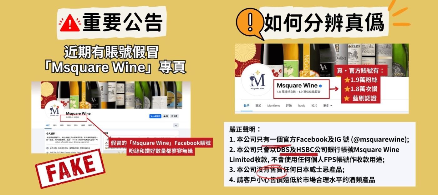 1. 本公司只有一個官方Facebook專頁 (www.facebook.com/msquarewine) 及 IG賬號 (@msquarewine),兩者均已有「藍剔」商家認證